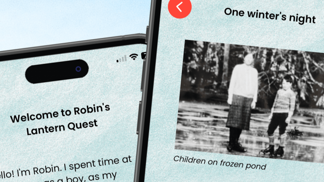 Robin's Lantern Quest sent families on a trail through the East Wood to collect six lanterns hidden around China Pond. Each lantern was unlocked using image triggering — visitors pointed their phone at specific lanterns to unlock and save them in their app. Collect all six, and a magical AR skating scene was unlocked — Robin skating on the frozen pond, surrounded by glowing lanterns.