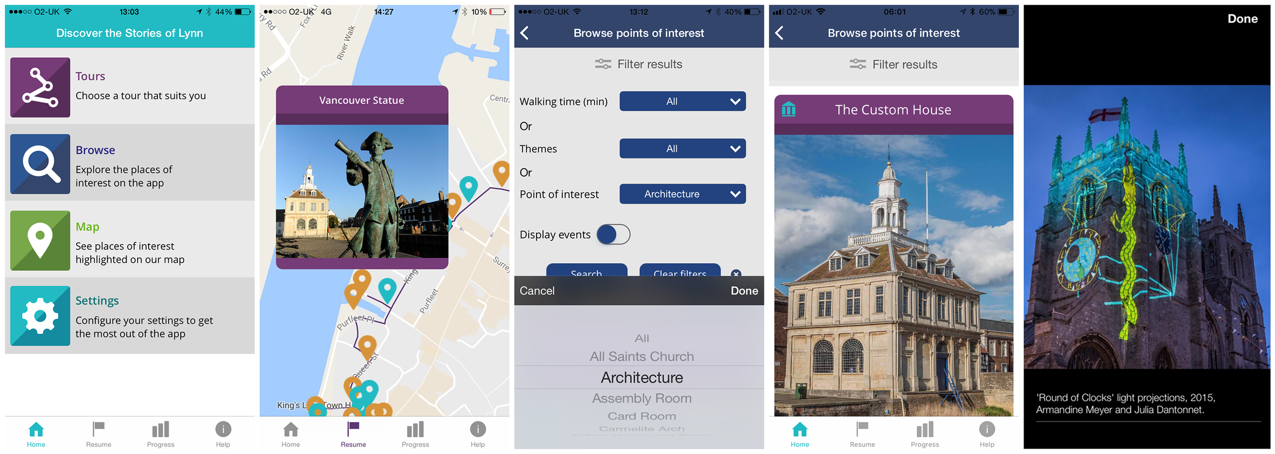 Selection of screenshots from the Stories of Lynn app, King's Lynn, Norfolk.
