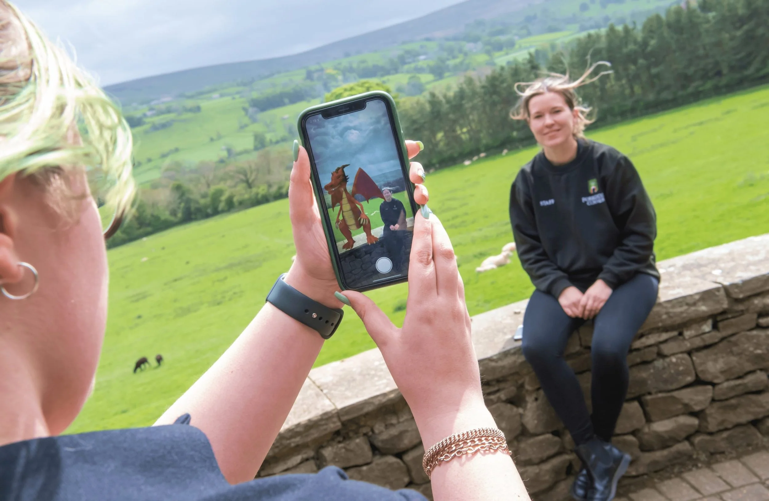 Taking a photo of an AR dragon, The Forbidden Corner Quest, The Forbidden Corner, North Yorkshire.